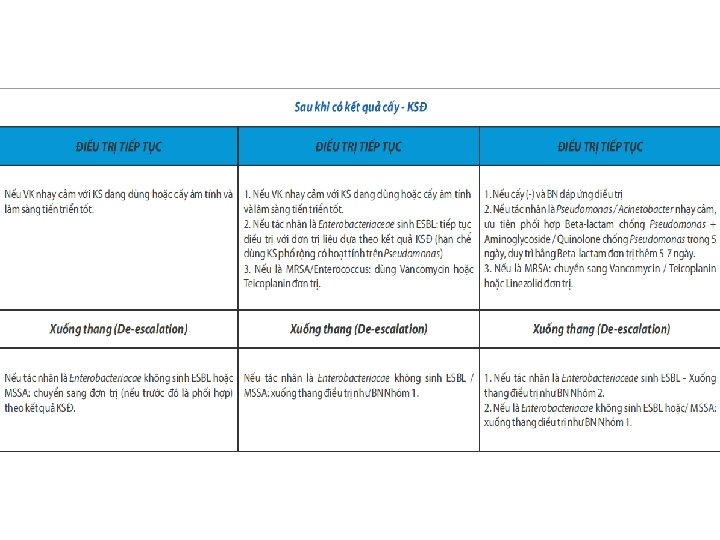 Những nguyên tắc chính Chọn lựa kháng sinh thích hợp • Lâ y bê nh phâ m xe t nghiê m vi sinh ho c trươ c khi cho KS • Bắt đầu điều trị KS theo kinh nghiệm với những NKBV, du ng đúng liều trong một thời gian thích hợp. Cho n như ng KS co đê kha ng thâ p nhâ t, không gây tô n ha i phu câ n, không la m thay đô i sinh tha i ho c cu a VK • Xem xe t như ng KS đô đă c biê t cu a đơn vi : ICU, khoa lâm sa ng trong cho n lư a điê u tri thi ch hơ p ban đâ u. • Khi co kê t qua vi sinh: xuô ng thang, thay đổi liều KS hoặc điều trị trên cơ sở các thông tin về vi khuẩn và sự đề kháng
