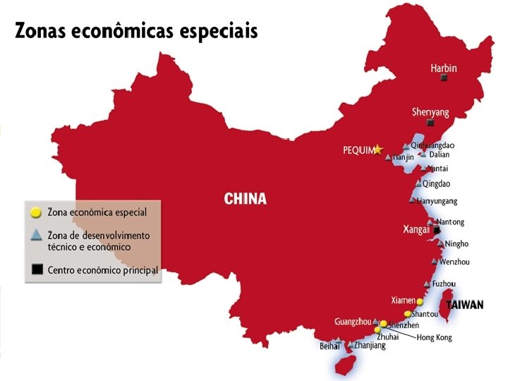 • 1960: URSS rompe com a China e o país busca de um modelo próprio de desenvolvimento; • 1976: morte de Mao Tse-tung. Assume o poder Deng Xiaoping com a política das 4 Grandes Modernizações: indústria, agricultura, ciência e tecnologia e Forças Armadas; • Criação das ZEEs litoral – China: made in; no país