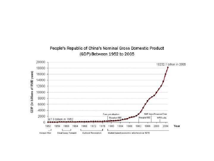 Modern China • 4 th largest country by area • The most populated country – 1. 3 Billion – 23% of the world’s population – 1 child policy to slow population growth • Moving toward a market economy • Still a communist government • World’s fastest growing economy – Over 2% GDP growth every year – Environmental pollution
