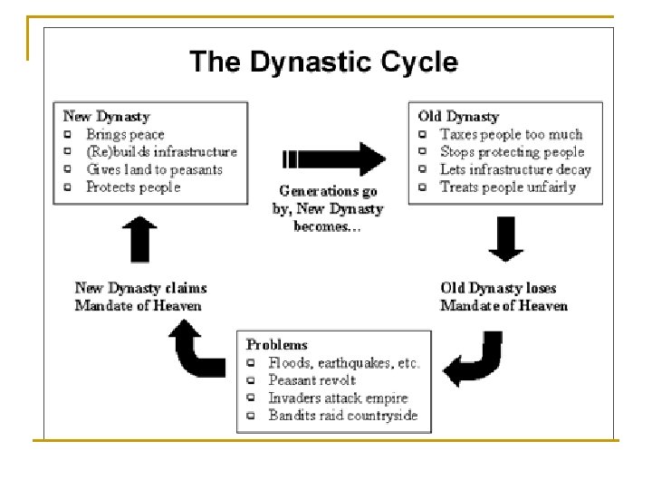 China n n n n Loess- fertile yellow-brown soil, carried by wind Dynasty- ruling family Mandate of Heaven- heaven granted the ruler the right to rule. People owed the ruler loyalty and obedience Feudalism- mode of production where king provides land, protection, people provide labor, soldiers Pictograph- writing- pictures or objects Ideograph- writing- symbols represent ideas Yin Yang- opposing forces that balance each other