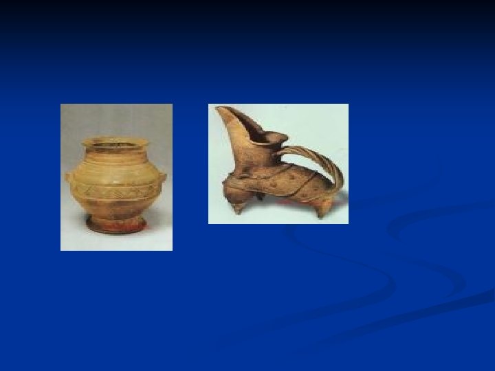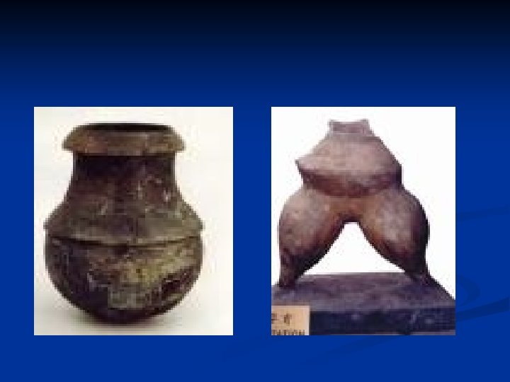 n The Hemudu Culture on the lower reaches of the Yangtze River dates to 5, 000 BC to 4, 000 BC. n Its discovery at Hemudu Village, Yuyao County, Zhejiang Province, east China, is equally important to studies of the New Stone Age in China. n Pottery ware unearthed here ---bowls, plates, basins, jars, etc. --- are black in color and in shape that are rarely seen in pottery artifacts belonging to other primitive cultures identified in China.