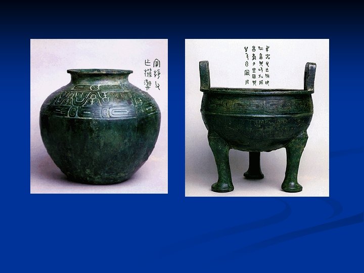 Bronze smelting techniques of the Shang period were fairly sophisticated. Meat, grain and wine vessels used by Shang rulers at sacrificial sites were all made of bronze. n In the Shang and succeeding dynasties, there was a wide spread use of bronze vessels in court ceremonies, banquets and burials, etc. In other words, bronze vessels were no longer used just as containers. They symbolized the power and positions of their owners. n