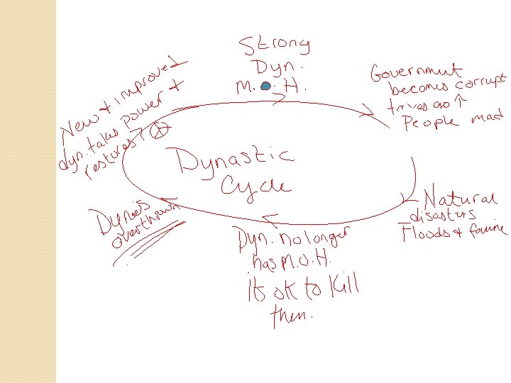 The Zhou �Around 1027 B. C. the Zhou established a dynasty. �They maintained Chinese culture – but injected new ideas. �Mandate of Heaven – the idea that the authority to rule comes from heaven. �The Zhou used this logic to overthrow the previous dynasty.