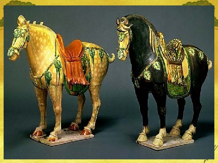 Tang Golden Age of Art £ Three-color ware was one of the greatest contributions of the Tang Dynasty £ Many figurines, predominantly horses and camels, were produced.