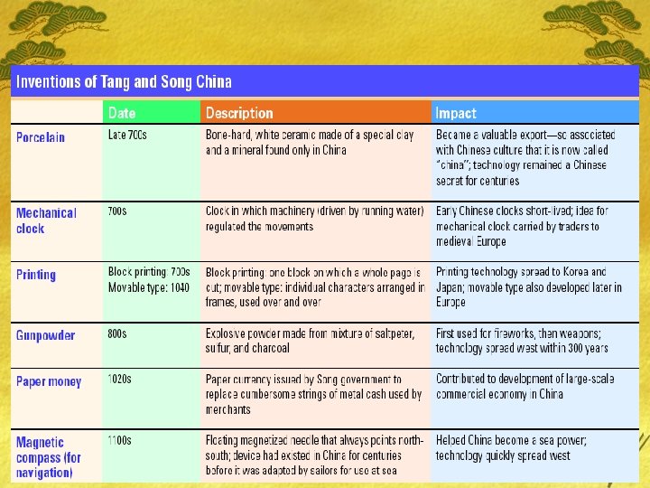Tang & Song Dynasties Compared Tang Only Expanded the empire, had a female ruler, adopted Buddhism Both Prospered through trade, improved agriculture, created great art and literature Song Only Ruled smaller empire, developed into great sea power, created paper money and movable type