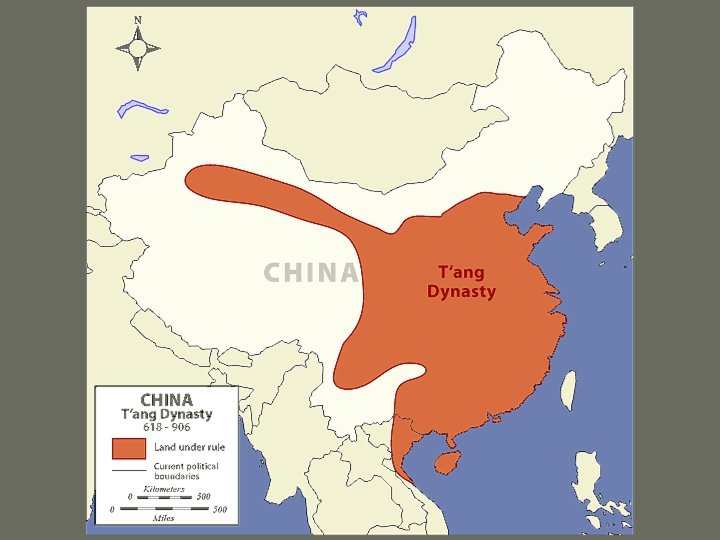 Tang (618 - 907 CE) • High point of Chinese culture • Rebuilt bureaucracy – Examination system – Confucian education – Limited social mobility • Buddhism supported, then oppressed • Invention of movable print, porcelain, gun powder