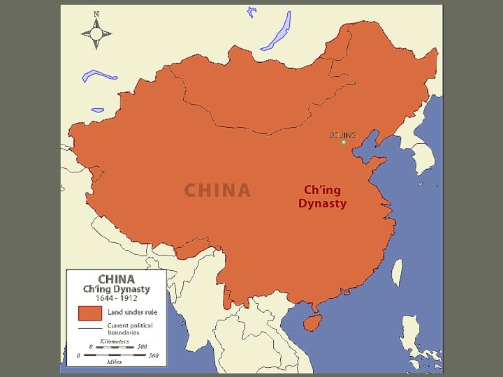 Qing (1644 - 1911 CE) • Manchus (from Manchuria) move south • Take Korea, Japan, then China • Manchus hold top posts, but relied upon scholar gentry • “Son of Heaven” concept emphasized • Would be final Chinese Dynasty • Eventually would be weakened by European / American interventions