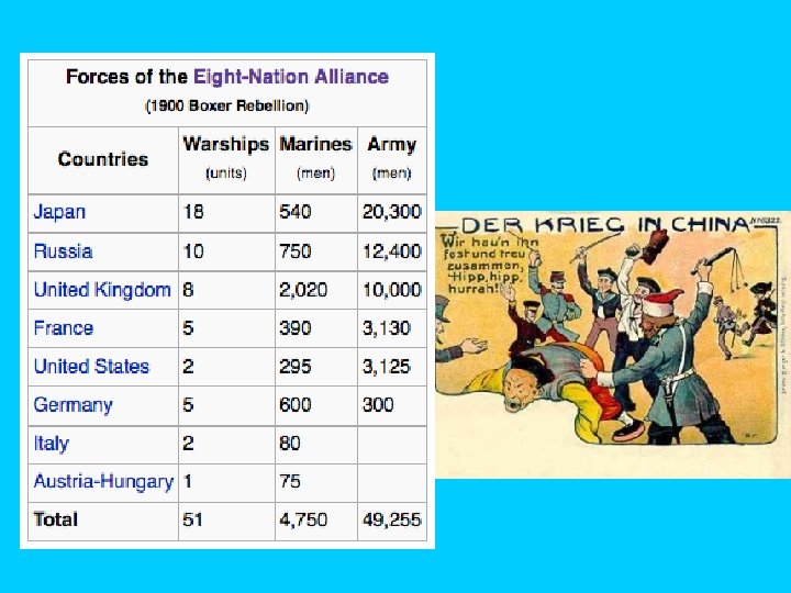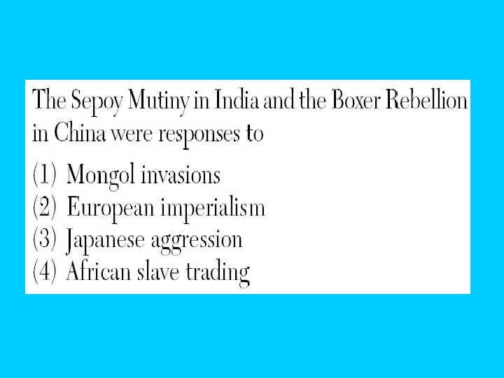 The Boxer Rebellion • Many Chinese resented the western influence in China which led to the Boxer Rebellion to, “drive out the foreign devils”. • The Boxers attacked foreigners across China. • As a result, the West and Japan organized a force to rescue foreigners in Beijing • They were defeated by the European powers, the U. S. and Japan.