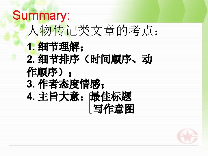 3. What’s the author’s attitude to Charlie Chaplin? A. positive B. negative C. serious D. appreciative 作者态度情感