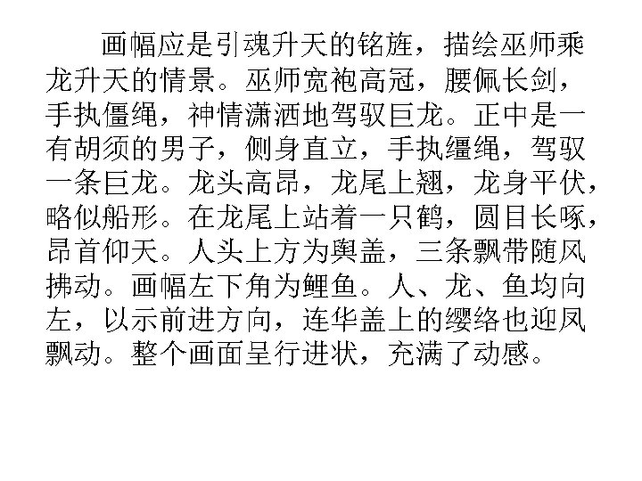 Among them portrait brick, with a wide range of subject matters, a variety of forms of expression, a style of pursuing likeness in spirit, simple but powerful, extensive and vigorous, was almost the symbol of the Han Dynasty art. The shaping skill, painting technique, and style of composition of coffin chamber mural all had broken through the simplex feature since the later Period of Spring and Autumn, laid a foundation for the maturity of Chinese painting. The T Shape Banner Painting
