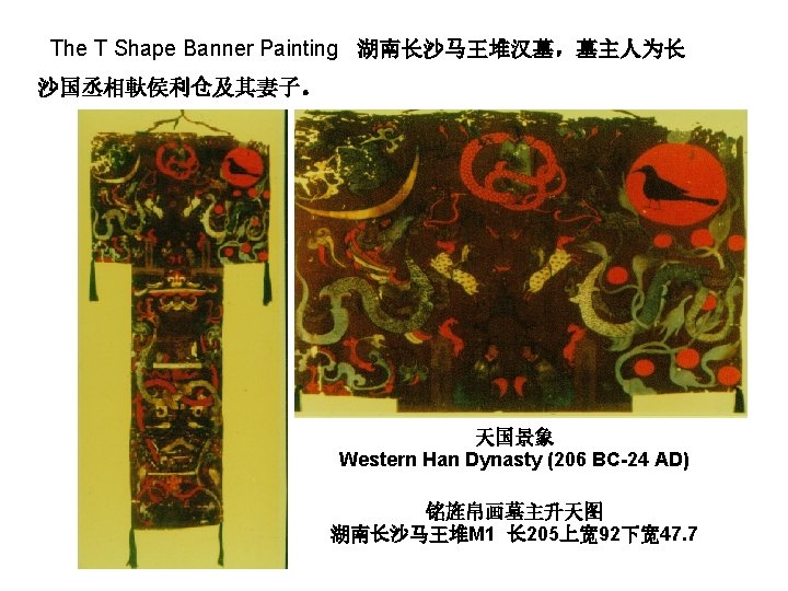 • The T shaped banner painting depicted the Chinese abstraction of the cosmos and the afterlife at the time. • On the T-shaped painted silk garment, the uppermost horizontal section of the T represents heaven. The bottom of the vertical section of the T represents the underworld. The middle (the top of the vertical) represents earth. In heaven we can see Chinese deities such as Nu wa and Chang e, as well as Daoist symbols such as cranes (representing immortality). Between heaven and earth we can see heavenly messengers sent to bring Lady Dai to heaven. Underneath this are Lady Dai's family offering sacrifices to help her journey to heaven. Underneath them is the underworld - two giant sea serpents intertwined. The funeral banner called “Mingjing”(铭旌).
