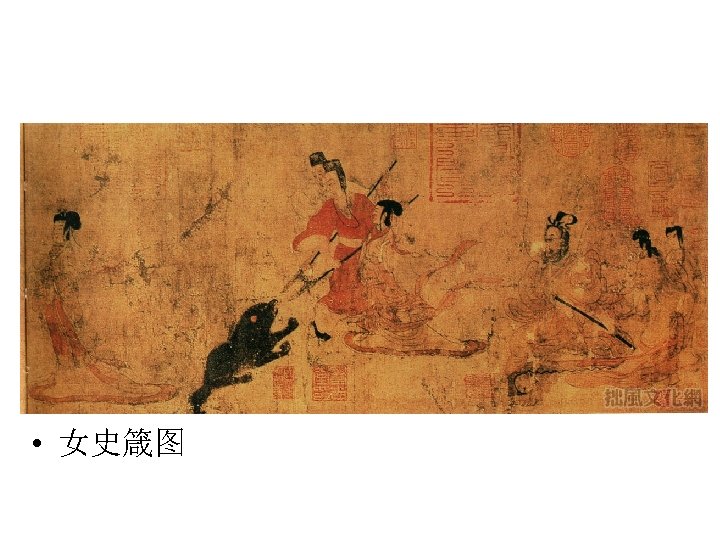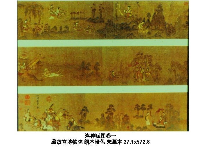 • It believes that Gu created more than 70 paintings based on historical stories, Buddha, human figures, birds, animals, mountains and rivers. His three existing paintings are the earliest hand scrolls far : • 1/ Admonitions of the Instructress to the Palace Ladies (《 女史箴图》). It illustrates nine stories from a political satire about (贾后) written by Zhang Hua(张华). Beginning in the eighth century, many collectors and emperors left seals, poems, and comments on the scroll. The Admonitions scroll was stored in the emperor's treasure until it was looted by the British army in the Boxer Uprising in 1900. Now it is in the British Museum collection, the copy in Tang dynasty. • 2/ Nymph of the Luo River. (《洛神赋图》) It survives in three copies dating to the Song dynasty. • 3/ Wise and Benevolent Women (《列女仁智图》) survives as a copy dating to the Song dynasty. It illustrates a subset of the women described in the Han dynasty work Biographies of Exemplary Women. •