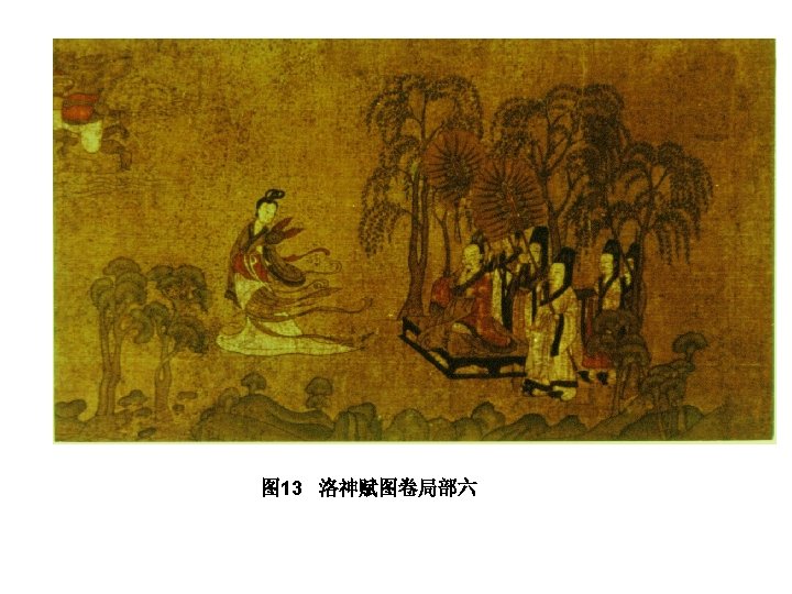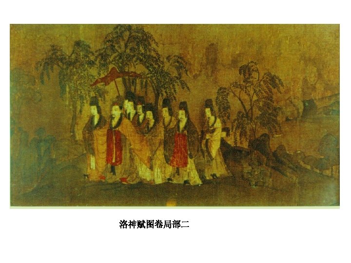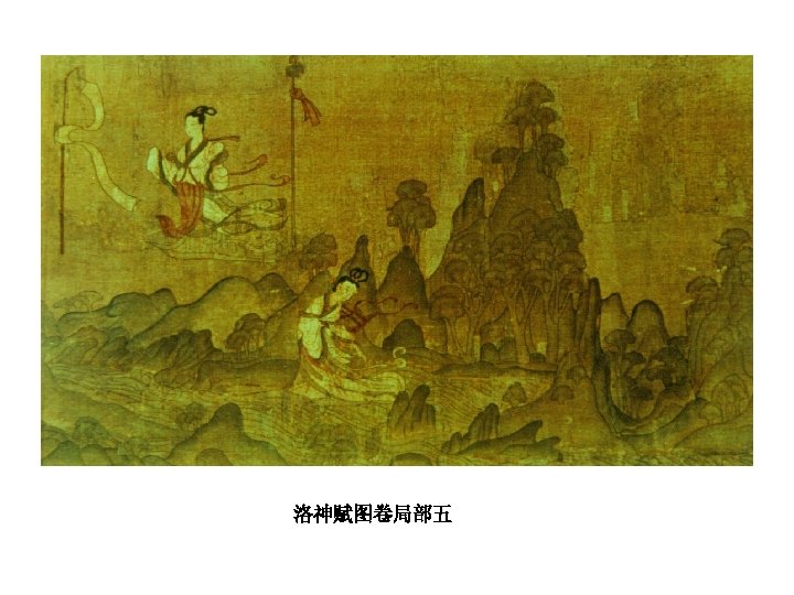 • Nymph of Luo River illustrates a romantic prose-poem by Cao Zhi (192 -232), the third son of Cao (155 -220) who ruled north China during the collapse of the Han dynasty (206 BCE-220). It depicts the meeting between Cao Zhi and the Goddess Luoshen at Luoshui River, vividly capturing the mood of their first meeting and eventual separation. Gu emphasized his subjects' expressions, with the stones, mountains and trees having an ornamental purpose. In some degree, Gu's paintings, are similar in style to the Dunhuang murals.