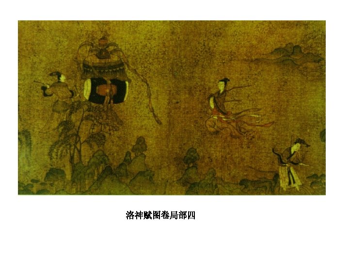 • The poetic narrative was interpreted by the painter in ten episodes. In the second section at the beginning of the scroll, Cao Zhi the noble poet, under a parasol with eight attendants, catches sight of a wondrous lady by the side of a cliff. As the poem described her, "The lady, with shoulders shaped as if by carving, waist narrow as though bound with white cords, is wearing a high coiffure. Her eyebrows are long and curving. " "Who could she be? " asked the poet. "Perhaps the Luo River Nymph, " replied the charioteer. At the water's edge, the Nymph's robe and scarves are fluttering in the breeze. In the seventh scene, the Nymph departs in a dragon-pulled carriage, escorted by two flying fish, a two-armed eel-like creature, a dragon-like animal with antlers, and two unicorns with white horns. With a companion, the Nymph glances back, appearing grieved and melancholy.