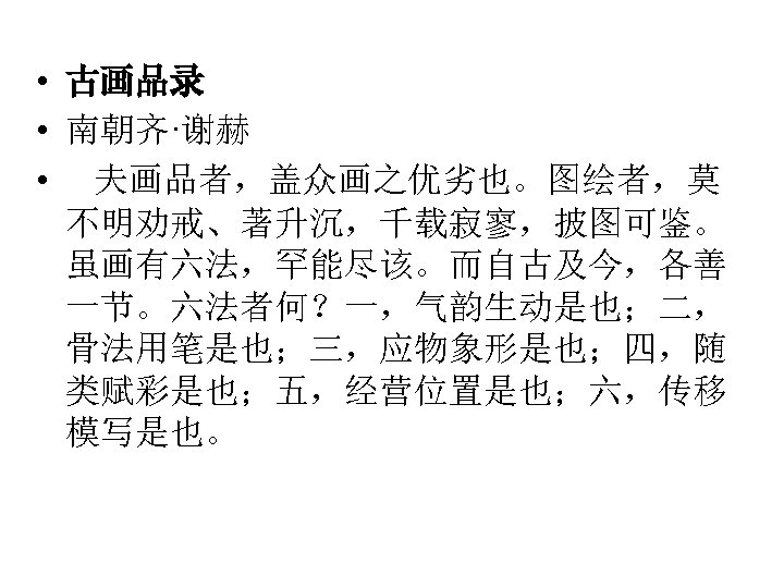 C. Six Principles • The “Six principles of Chinese painting” were established by Xie He (谢赫,479-502), a writer, art historian and critic. He is most famous for his "Six principles for painting, 绘画六法), taken from the preface to his book "The Record of the Classification of Old Painters" (《古 画品录》). Keep in mind that this was written circa 550 A. D. and refers to "old" and "ancient" practices. The six elements that define a painting are: • •