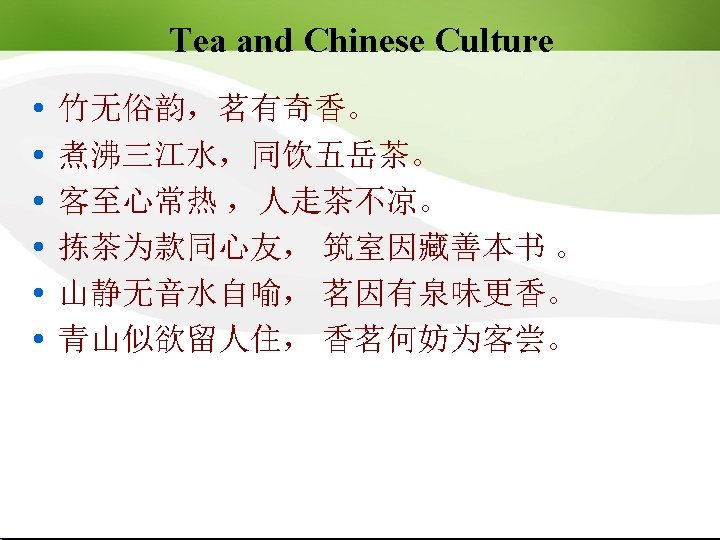 Chinese Tea Culture Introduction China, the Hometown of Tea The Importance of Tea in People’s Daily Life Classification of Tea and Health Tea Custom Tea Ceremonies Gongfu Tea and Chinese Culture Tea Service Master Tea utensils