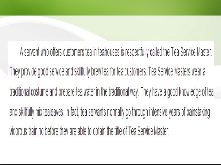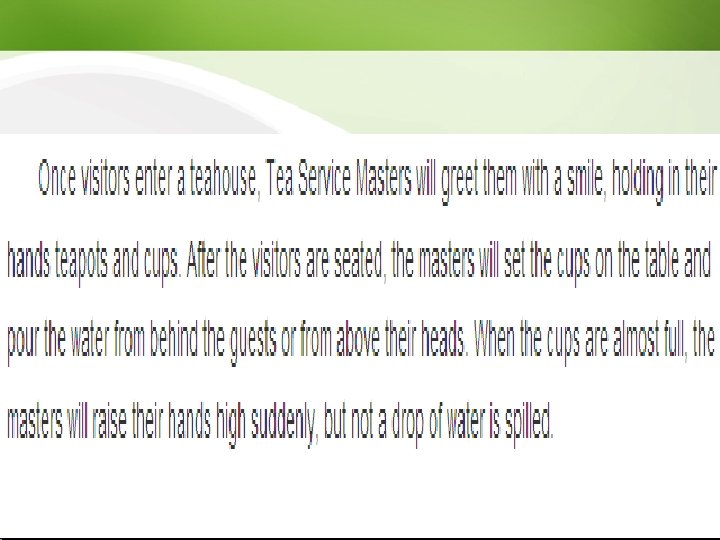 Social Functions l As a sign of respect: The younger generation shows its respect to the older generation by offering a cup of tea. l To apologize: People make serious apologies to others by pouring them tea. (a sign of regret and submission) l To express thanks to your elders on your wedding day: Traditionally, both the bride and groom kneel in front of their parents and serve them tea.