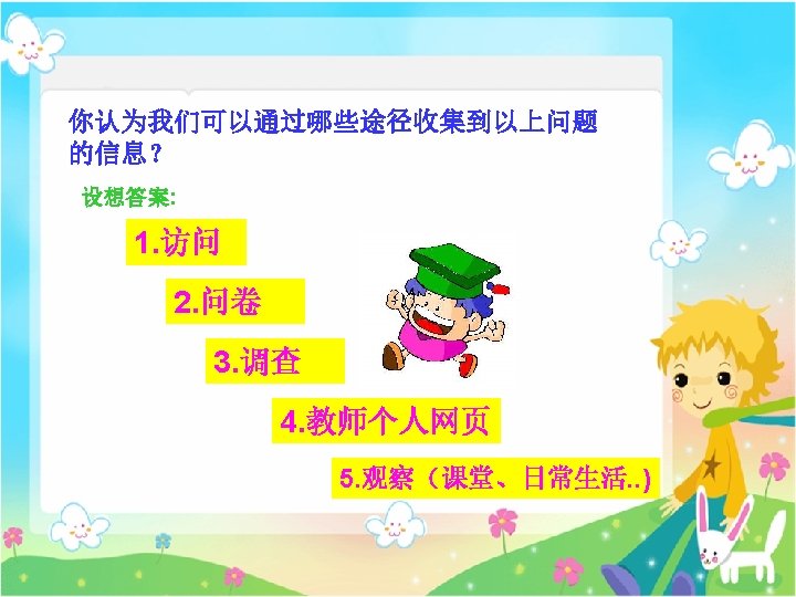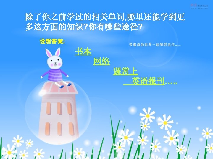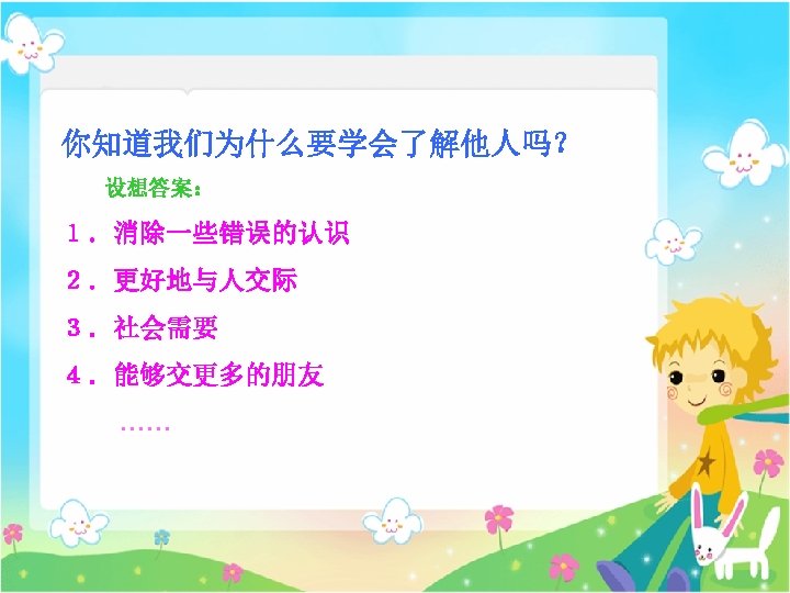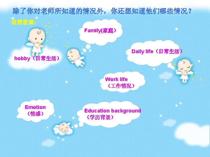 你会用英语描述人物吗? 对于Chinese teacher, math teacher, English teacher, 你会怎么描述? 设想答案: My Chinese teacher is Miss Han. She is an old woman. She’s tall and strong. She teaches well. She has small eyes and a big nose. She is very nice . Miss Liu is my math teacher. She has long hair. She’s beautiful. She has a daughter, Kelly. I think Miss Liu is a good teacher and good mother. Miss Zhang is our English teacher. She isn’t tall. She has big eyes and small ears. Sometimes she is strict. But she is kind. We love her very much.
