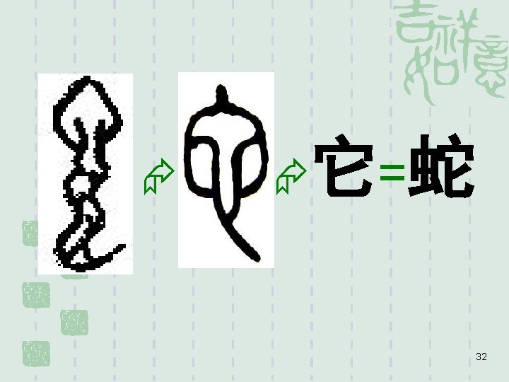 § 形声:picto-phonetic formation combines the pictographic symbol with the phonetic one to signify both the meaning and pronunciation of a word. § For example, “山旁必言山,水旁必言水”the mountain radical connotes relations to mountains while the water radical water. e. g: 31