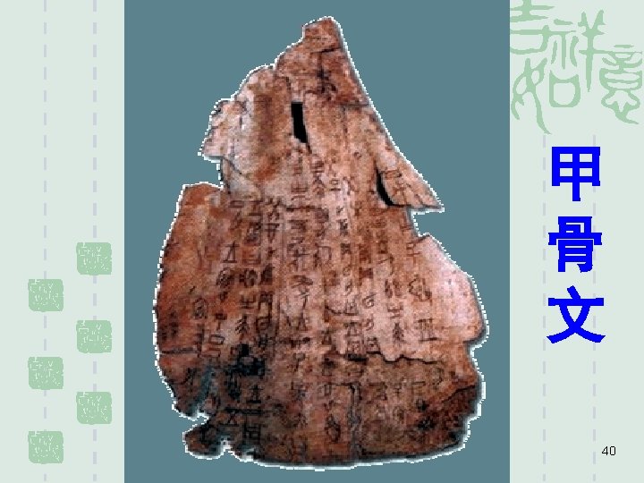 篆 体 zhua n style § The period lasted about 1200 years, from 1400 B. C. to 206 B. C. when Qin Dynasty came to an end; § The period included the Yin dynasty, Zhou dynasty and Warring States in which writing appeared on turtle bones (for oracle divination) and bronze vessels (for records and rituals or affairs of the State). 39