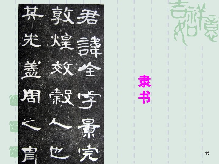 § 小篆:small seal was the official script after the unification of China (B. C. 221); prior to that, there had been various writing styles, systems of measurement and standards of currency. To better rule the country, the emperor decided to“ 书同文、车同轨、统一度量衡”(“write the same language, standardize vehicle axles, and make uniform benchmarks of measurement). Small or lesser seal script became the standard. § 隶体/隶书: official script originated in the warring states period prior to the unification and was a popular writing style until the period of the Three Kingdoms, lasting about 500 years (221 B. C. ~ 300 A. D. ) 44