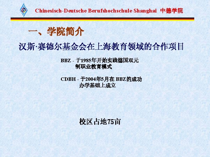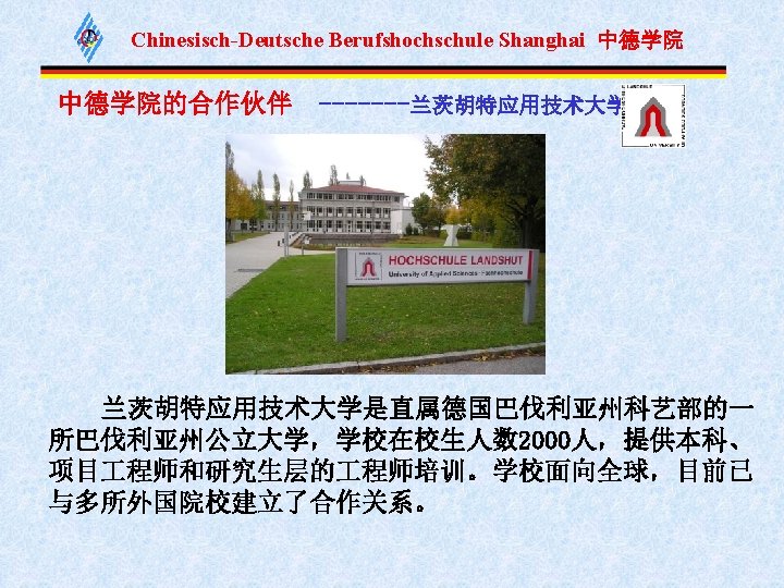 Chinesisch-Deutsche Berufshochschule Shanghai 中德学院 兰茨胡特应用技术大学为中德学院的建设和发展提供专 业支持 Die FH Landshut unterstützt die CDBH beim fachlichen Aufbau und Entwicklung