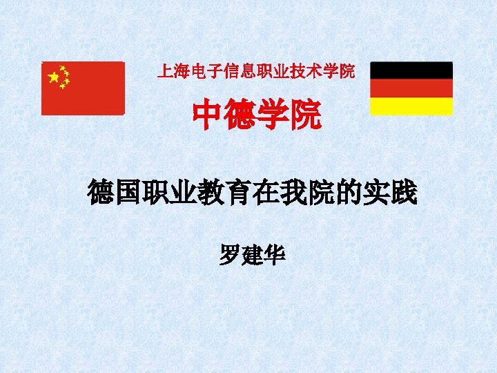Chinesisch-Deutsche Berufshochschule Shanghai 中德学院 办学特色 Ausbildungsprofil • 培养目标以职业能力为本位 Die Ausbildung orientiert sich an Berufsqualifikationen • 专业设置以职业分析为导向 Die Ausbildungsberufe orientieren sich an die Bedarfsanalyse • 课程设置以职业技能为核心 Das Fachsystem hat die Berufsqualifikation im Kernpunkt • 教学过程以 学结合为特点 Die Ausbildung besteht aus Theorie und Praxis