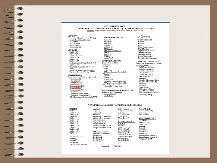 What Do the UCs Look For? G. P. A. Test Scores Courses Completed/Planned Honors Courses Top 9% Local Context (ELC) Quality of Senior Year – Program of Study Academic Opportunities in – California High Schools Performance in Academic Subject Areas Achievements in Special Projects Improvement in Academic Performance Special Talents, Achievements, and Awards Participation in Educational – Preparation Programs Academic Accomplishment Within Life Experiences Geographic Location