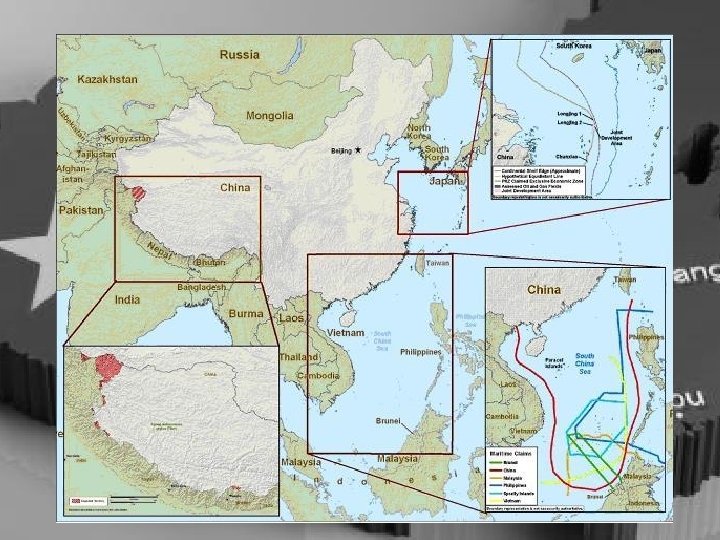 Roszczenia regionalne Chin Trzy z chińskich głównych sporów terytorialnych w oparciu o wierzytelności znajdują się na odcinku stanowiącym granicę z Indiami i Bhutanem, Morzu Południowochińskim i Japonią na Morzu Wschodniochińskim.