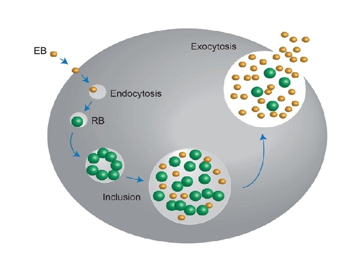 Have a complex developmental cycle The infectious form is called an Elementary Body (EB) which is ) circular in form and is taken into the cell by induced phagocytosis. Inside the phagocytic vesicle replication takes place. Over the next 6 -8 hours, the EB reorganizes into the noninfectious, but metabolically active Reticulate Body (RB) which is larger and less dense than the EB. For 18 -24 hours the RB synthesized new materials and divides by RB binary division to form Inclusion Bodies that reorganize and Inclusion Bodies condense into EBs Between 48 -72 hours, the cell lyses and releases the EB which begin the cycle again.
