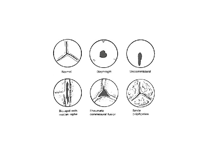 Aortální stenóza: etiologie • Degenerace : senilní kalcifikace normální chlopně (proces podobný aterosklerose) Koincidence s koronární chorobou u >50% věk >60 let • Vrozené abnormality: bikuspidální chlopeň 1 -2% populace, u 80% časná fibróza a kalcifikace věk 40 -60 let • Revmatická
