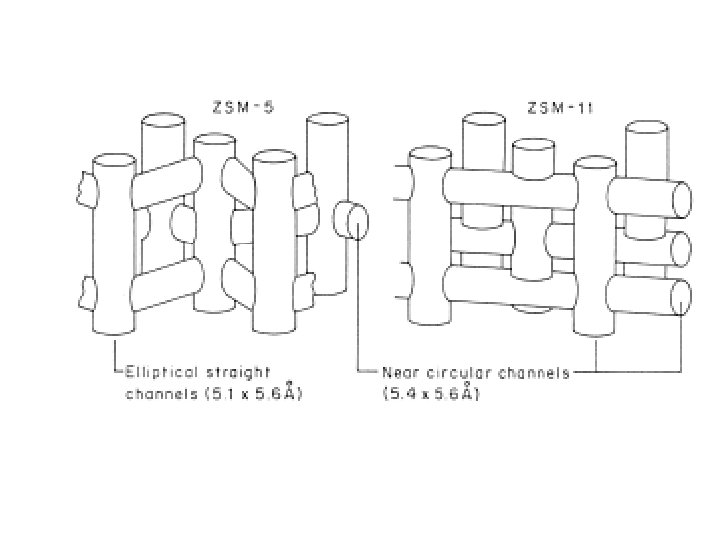 • In ZSM-5, these channels are 5. 3 x 5. 6 and 5. 1 x 5. 5 Å; • In mordenite, 7. 0 x 6. 7 and 2. 6 x 5. 7 Å. • Zeolite L has lobed channels, not interconnected; the lobes are 7. 5 Å across, with apertures between them of 7. 1 Å.