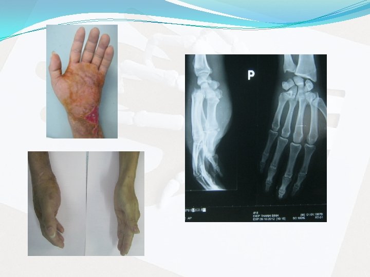 CA L M SÀNG 2: BN Mai V C. Nam, 32 t, Làm ruộng Té xe máy, CT tay T + chân P BV khác mổ KHX chân P + nẹp bột tay > 1, 5 th BVCTCH Dày bàn tay T Tê nhẹ đầu ngón Hạn chế vận động cổ tay, bàn tay Sức nắm (P) 30 kg, (T) 4 kg