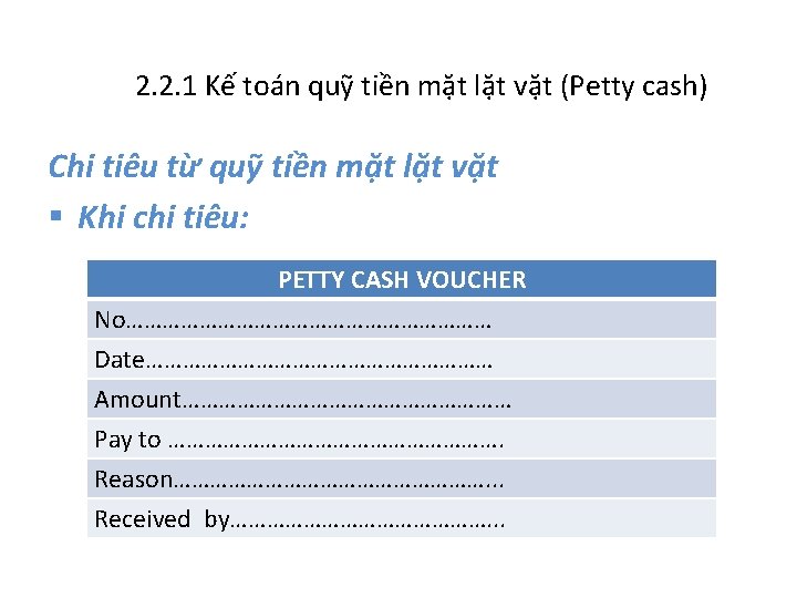 2. 2. 1 Kế toán quỹ tiền mặt lặt vặt (Petty cash) § Thiết lập quỹ tiền mặt lặt vặt § Chi tiêu từ quỹ tiền mặt lặt vặt § Tái lập quỹ