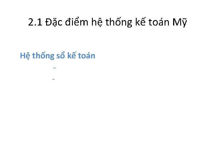 2. 1 Đặc điểm hệ thống kế toán Mỹ 1. 2. 3. 4. 5. Đối tượng và phương trình kế toán Phương thức kế toán Chu trình kế toán Hệ thống tài khoản Hệ thống sổ