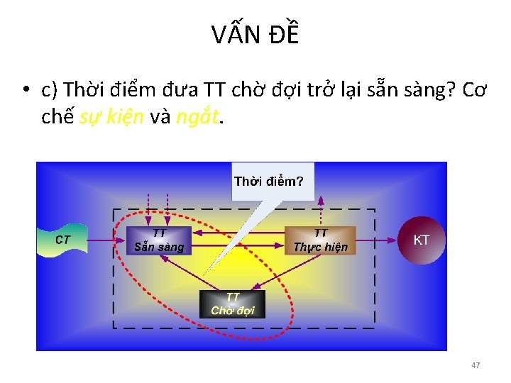 VẤN ĐỀ • Thời gian thực hiện tiến trình: – Không đẩy ra (Nonpreemptive), (Xử lý theo lô) – Có đẩy ra (Preemptive) (Phân chia thời gian) Lượng tử thời gian: 0. 03” 0. 2”. 46