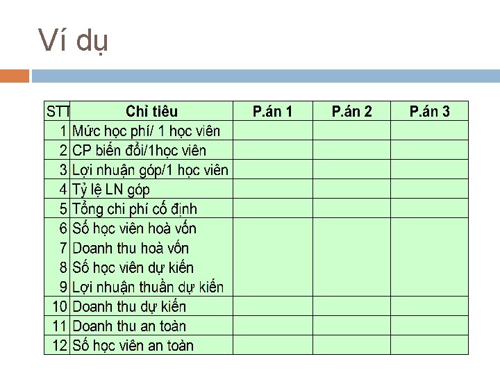 Ví dụ Viện Kế toán - Kiểm toán mở lớp bồi dưỡng nghiệp vụ kế toán thuế. Mỗi lớp học tổ chức trong 10 buổi. Dự tính mức học phí 600. 000đ/người thì mỗi lớp học sẽ có khoảng 25 học viên. Mức học phí 500. 000đ/người thì mỗi lớp học sẽ có khoảng 32 học viên. Mức học phí 400. 000đ/người thì mỗi lớp học sẽ có khoảng 42 học viên. Chi phí cho mỗi lớp học gồm: Chi cho giáo viên 500. 000đ/buổi; Thuê phòng: 100. 000đ/buổi Quảng cáo & quản lý: 3. 000đ/lớp Tài liệu, chứng chỉ: 100. 000đ/học viên Hãy xác định số học viên cần thiết để đạt hoà vốn theo từng mức học phí và nên thu học phí ở mức nào?