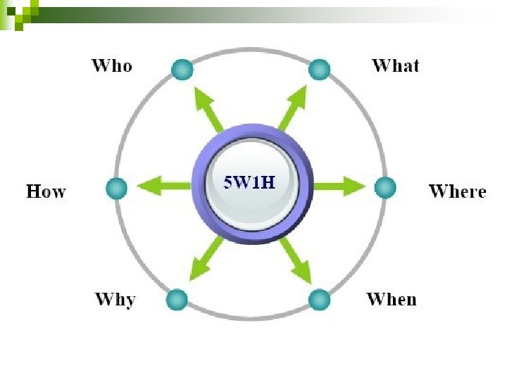 WHY? (Tại sao? ) - Tại sao nó xẩy ra? - Tại sao phải nghiên cứu vấn đề này? n WHO? (Ai? ) - Ai đã chứng kiến sự việc đó? - Ai làm điều đó? - Ai viết bài này? -… n HOW? (Như thế nào? ) - Sự kiện xẩy ra như thế nào? - Công việc đó sẽ như thế nào? n -. . . n