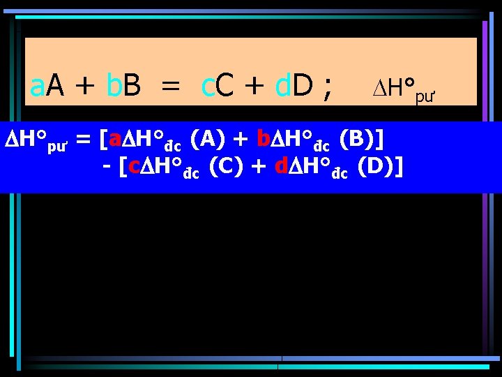 Phương trình nhiệt hóa học 2 C(gr) + 2 O 2(k) = 2 CO 2(k) ; H 0298= -787, 02 k. J Đây là pư toả nhiệt. Ø H được tính với giả thiết : pư xảy ra hoàn toàn , chất đầu và sản phẩm theo lượng hợp thức và trạng thái vật lý tương ứng với pư. Nhiệt độ có thể biến đổi trong quá trình pư nhưng mọi tính toán được thực hiện khi nhiệt độ cuối bằng nhiệt độ đầu.