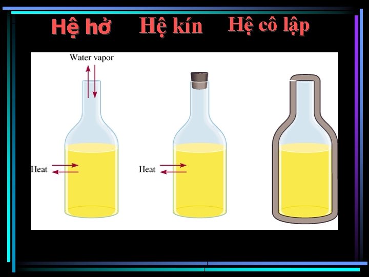 Hệ đoạn nhiệt - không trao đổi chất và nhiệt. - Có thể trao đổi công Hệ đồng thể - không có bề mặt phân chia Hệ đồng nhất- thành phần tính chất như nhau Hệ dị thể- có bề mặt phân chia