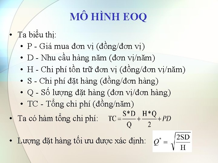 MÔ HÌNH EOQ • Mô hình lượng đặt hàng kinh tế cơ bản (basic economic order quantity model – EOQ) • Tổng chi phí tồn kho là hàm của một số biến như kích thước lô hàng cần đặt. Ta phải tìm mức tối ưu của biến này để cho chi phí cực tiểu • Lượng hàng tồn kho là một hàm biến thiên theo thời gian. • Không cho phép có thiếu hụt, mỗi đơn hàng đến đúng vào lúc lượng hàng tồn kho = 0