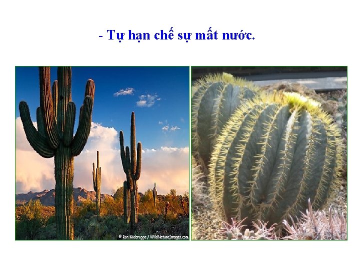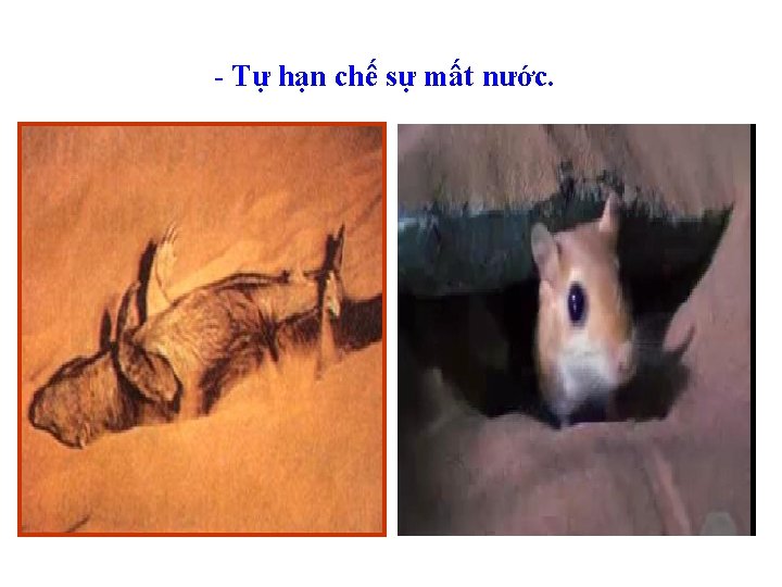 -Tự hạn chế sự mất nước: lá bọc sáp hay biến thành gai, bò sát sống vùi trong cát kiếm ăn vào ban đêm…. .