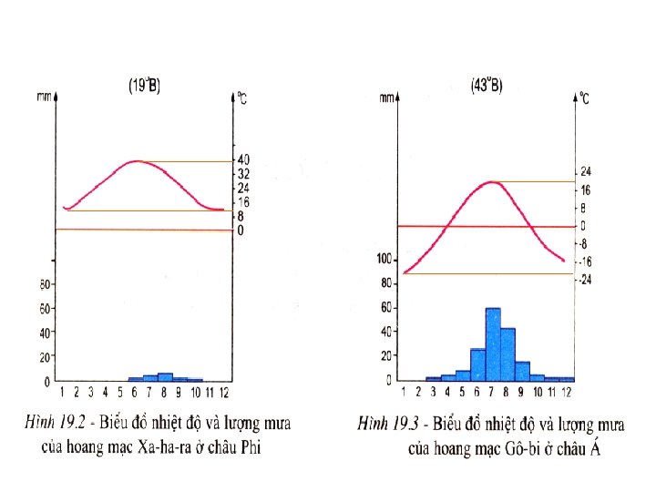 Quan sát hình 19. 2 và 19. 3 : - Nêu đặc điểm chung của khí hậu hoang mạc. - So sánh sự khác nhau về chế độ nhiệt của hoang mạc ở đới nóng và đới ôn hoà.