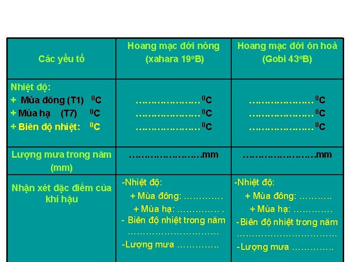 Nêu Các đặc yếu điểm tố khí hậu hoang mạc Nhiệt độ: + Mùa đông (T 1) 0 C + Mùa hạ (T 7) 0 C + Biên độ nhiệt: 0 C Lượng mưa trong năm Hoang mạc đới nóng (Xahara 19 o. B) Hoang mạc đới ôn hoà (Gobi 43 o. B) 12 0 C 40 0 C 28 0 C - 22 0 C 19 0 C 41 0 C 21 (mm) 130 (mm) Nhận xét đặc điểm của khí hậu -Nhiệt độ: + Mùa đông: ấm + Mùa đông: Rất lạnh + Mùa hạ: Rất nóng +Mùa hạ: không quá nóng - Biên độ nhiệt trong năm cao Rất cao -Lượng mưa: rất ít -Lượng mưa: ít