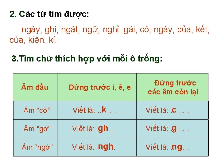 2. 1 : chứa tiếng bắt đầu bằng ng hay ngh 2 : chứa tiếng bắt đầu bằng g hay gh 3 : chứa tiếng bắt đầu bằng c hay k 1 2 Mùng 2 tháng 9 năm 1945 - một ngày đáng ghi nhớ. Hà 1 Nội tưng bừng màu đỏ. Một vùng trời bát ngát cờ, đèn, hoa và 1. biểu ngữ 2 Các nhà máy đều nghỉ việc. Chợ búa không họp. Mọi hoạt động sản xuất, buôn bán của thành phố tạm ngừng. Già, trẻ, gái. 2 , trai đều xuống đường. Mọi người đều thấy mình cần có 1 3 mặt trong ngày hội lớn của dân tộc. ……………… 3 thúc bằng những lời thề độc lập. Đó là ý chí của Buổi lễ kết toàn dân Việt Nam kiên quyết thực hiện lời Hồ Chủ tịch trong bản tuyên ngôn: “……………. …” Lịch sử đã sang trang. Một kỉ nguyên mới bắt đầu: nguyên của Độc lập, Tự do, Hạnh phúc. kỉ