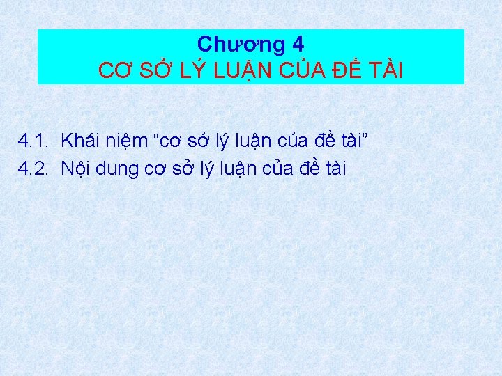 Nội dung cơ sở lý luận đề tài • Bám sát mục tiêu, phù hợp nội dung đề tài làm luận cứ cho đề tài • Lý thuyết: Các khái niệm, qui luật, nguyên lý liên quan (Luật, văn bản < luật) • Thực tiễn: Đi từ xa đến gần và đến điểm nghiên cứu; từ ngoài nước vào trong nước, đến địa điểm nghiên cứu. • Group: Viết tên đề tài, mục tiêu, mục lục cơ sở lý luận, trong đó có khái niệm của đề tài nghiên cứu.