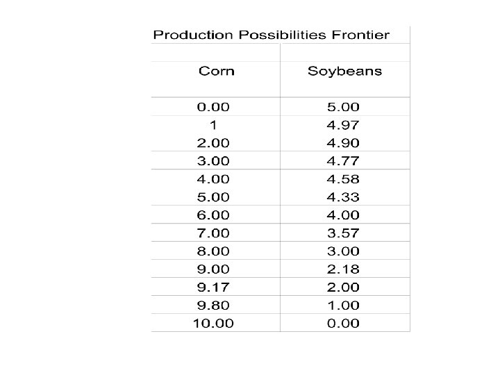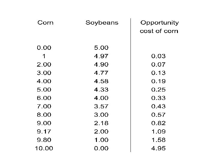 • Note that as the output of corn increases the opportunity cost of an additional unit increases. • Note also that the slope of the production possibilities frontier measures the opportunity cost. It gives the rate of change in soybeans with respect to corn.