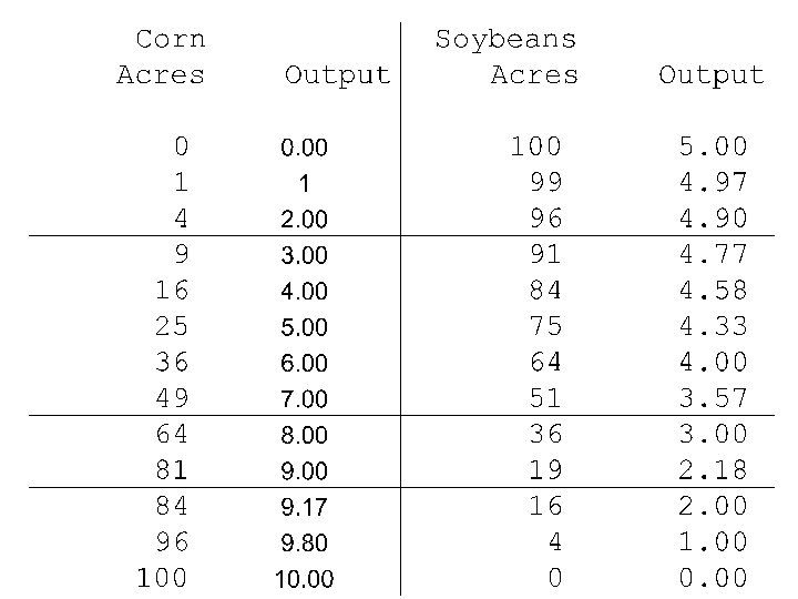 Measuring Opportunity Cost • The Jonsons own a farm in Iowa, 100 acres. They are crop farmers and the reasonable crops to consider are corn and soybeans. The major decision for the year is how much corn to grow and how much soybeans to grow. What trade-off do they face?