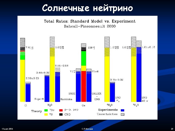 Эксперимент SNO CC Kevin Graham NOON 2004 n e + d p + e− - Q = 1. 445 Me. V - good measurement of e energy spectrum - some directional info (1 – 1/3 cos ) - e only NC n x + d p + n +n x - Q = 2. 22 Me. V - measures total 8 B flux from the Sun - equal cross section for all types ES n x + e− - low statistics - mainly sensitive to e, some and - strong directional sensitivity 13 мая 2004 С. П. Михеев 18