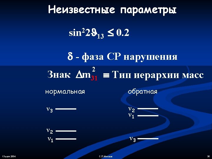 Уравнение эволюции i d dt a = H a 2 2 1 H Udiag(0, m 21, m 31)U* + diag(V, 0, 0) 2 E 2 mji H 2 m 31 α= 13 мая 2004 2 E = 2 mj - 2 mi Udiag(0, α, 1)U* + V = 2 GFNe 2 diag(2 EV/ m 31, 0, 0) 2 2 m 21/ m 31 С. П. Михеев 27